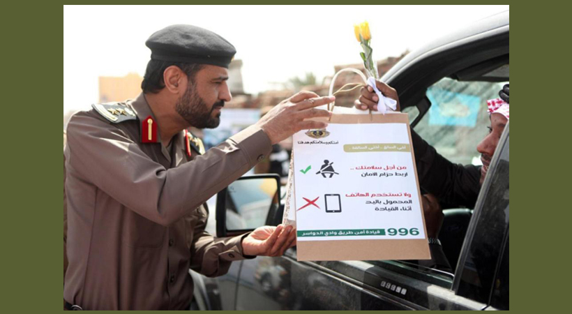 നിങ്ങളുടെ സുരക്ഷ ഞങ്ങളുടെ പരിഗണന എന്ന റോഡ് സുരക്ഷയുടെ ഭാഗമായി സൗദിയിലെ വാദി അല് ദവാസിര് ട്രാഫിക്ക് പോലീസ് നടത്തുന്ന കാമ്പയിന്റെ ഭാഗമായി ലീഫ്ലെറ്റ് വിതരണം ചെയ്യുന്നു.