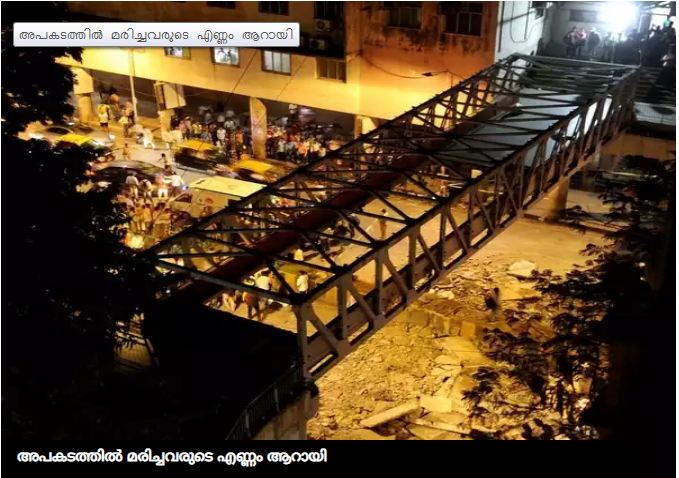 രാത്രി 7.35ന് ആയിരുന്നു അപകടം. പാലത്തിലെ രണ്ട് കോണ്ക്രീറ്റ് സ്ലാബുകള് അടര്ന്ന് റോഡിലേക്ക് വീണു. മരിച്ചവരില് രണ്ടുപേര് നഴ്സുമാരാണ്. 2016ല് അറ്റകുറ്റപ്പണി പൂര്ത്തിയായ പാലമാണിത്. 2018ല് അന്ധേരിയില് ഒരു റെയില്വേ പാലം തകര്ന്നിരുന്നു. ഇതിന് ശേഷം ഐഐടി ബോംബേ നടത്തിയ പഠനത്തില് 18 പാലങ്ങള് അപകടസാധ്യതയുള്ളതാണെന്ന് വിലയിരുത്തി. പക്ഷേ, ഇപ്പോള് തകര്ന്ന പാലം ഇതില് ഉള്പ്പെട്ടിരുന്നില്ല.