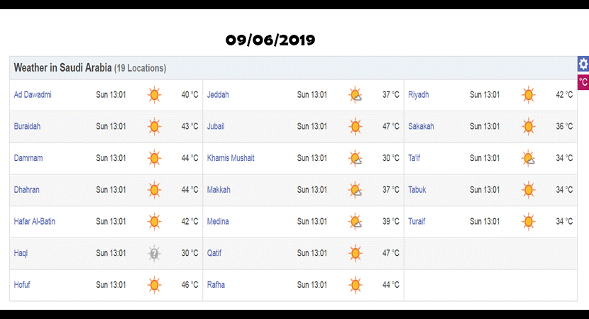 ജിദ്ദ: സൗദി അറേബൃ കടുത്ത ചൂട് സീസണിലേക്ക് നീങ്ങുകയാണ്. ഇന്ന്(ജൂണ് 9)ന് ഉച്ച സമയത്ത് ഏറ്റവും കൂടിയ ചൂട് രേഖപ്പെടുത്തിയത് ജുബൈല്, ഖത്തീഫ് എന്നിവിടങ്ങളില് 47 ഡിഗ്രിയാണ്. വരും ദിവസങ്ങളില് ചൂട് വര്ദ്ദിക്കാനാണ് സാധൃത.