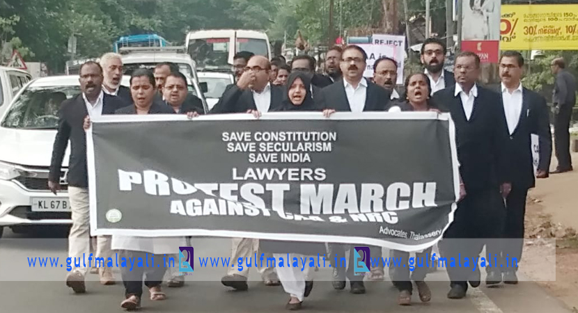 തലശ്ശേരി: പൗരത്വ ഭേദഗതി ബില്ലിനെതിരെ തലശ്ശേരി ജില്ല കോടതിയിലെ വിവിധ അഭിഭാഷക സംഘടനകളുടെ നേതൃത്വത്തിൽ പ്രതിഷേധ പ്രകടനം നടത്തി. വൈകിട്ട് 3 ന് കോടതി പരിസരത്തു നിന്നും ആരംഭിച്ച പ്രകടനം നഗരം ചുറ്റി പുതിയ ബസ്റ്റാന്റിൽ പൊതുയോഗത്തോടെ സമാപിച്ചു. അഡ്വ.പി ശശി ഉദ്ഘാടനം ചെയ്തു. അഡ്വ. പി.വി സൈനുദ്ദീൻ അധ്യക്ഷത വഹിച്ചു. വിനോദ് ചമ്പളാൻ, കെ.എ.ലത്തീഫ്, കെ.സി രഘുനാഥ്, കെ. വിശ്വൻ, ജോളി മാത്യു, കെ.അജിത്ത്, ജഗദീഷ്, ജി.പി.ഗോപാലകൃഷ്ണൻ സംസാരിച്ചു.