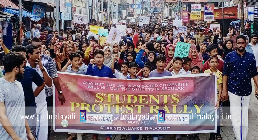 തലശ്ശേരി: പൗരത്വ ഭേദഗതി നിയമത്തിനെതിരെ തലശ്ശേരി നഗരത്തിൽ വിദ്യാർത്ഥി കൂട്ടായ്മ നടത്തിയ പ്രതിഷേധ റാലി വിദ്യാർത്ഥികളുടെ പങ്കാളിത്തം കൊണ്ടും സംഘാടന മികവ് കൊണ്ടും ശ്രദ്ധേയമായി.