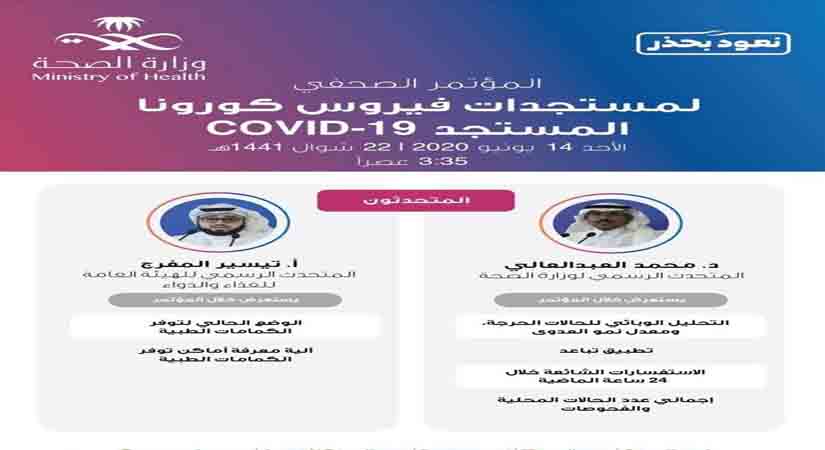 ഇന്ന് ഞായറാഴ്ച നടക്കുന്ന പത്രസമ്മേളനത്തില് ആരോഗ്യ മന്ത്രാലയം ഔദ്യോഗീക വക്താവ് ഡോക്ടര് അബ്ദുല് ആലിയുടെ വാര്ത്താസമ്മേളനം സൗദി സമയം വൈകുന്നേരം 3.35ന് തുടങ്ങും. ശേഷം സൗദി ഫുഡ് ആന്റ് ഡ്രഗ്സ് അതോറിറ്റി വാക്താവ് തൈസീര് അല് മുഫ്രിഹിന്റെ വാര്ത്താസമ്മേളനവും ഉണ്ടായിരിക്കും.