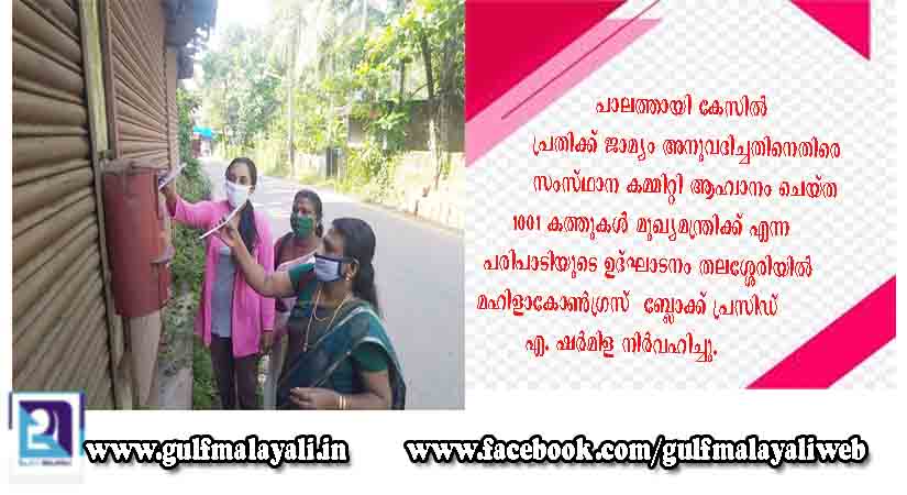 തലശ്ശേരി: പാലത്തായി കേസില് പ്രതിക്ക് ജാമ്യം അനുവദിച്ചതിനെതിരെ സംസ്ഥാന കമ്മിറ്റി ആഹ്വാനം ചെയ്ത 1001 കത്തുകള് മുഖ്യമന്ത്രിക്ക് എന്ന പരിപാടിയുടെ ഉദ്ഘാടനം തലശ്ശേരിയില് മഹിളാകോണ്ഗ്രസ് ബ്ലോക്ക് പ്രസിഡണ്ട് എ. ഷര്മിള നിര്വഹിച്ചു.