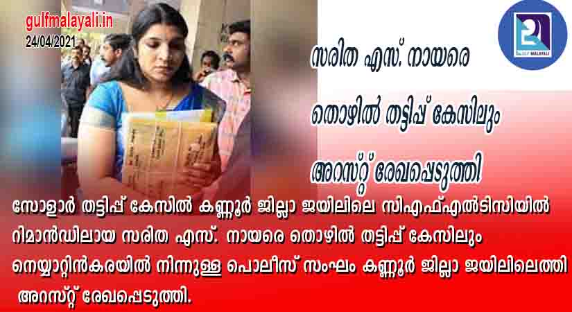 സരിത എസ്. നായരെ തൊഴില് തട്ടിപ്പ് കേസിലും അറസ്റ്റ് രേഖപ്പെടുത്തി