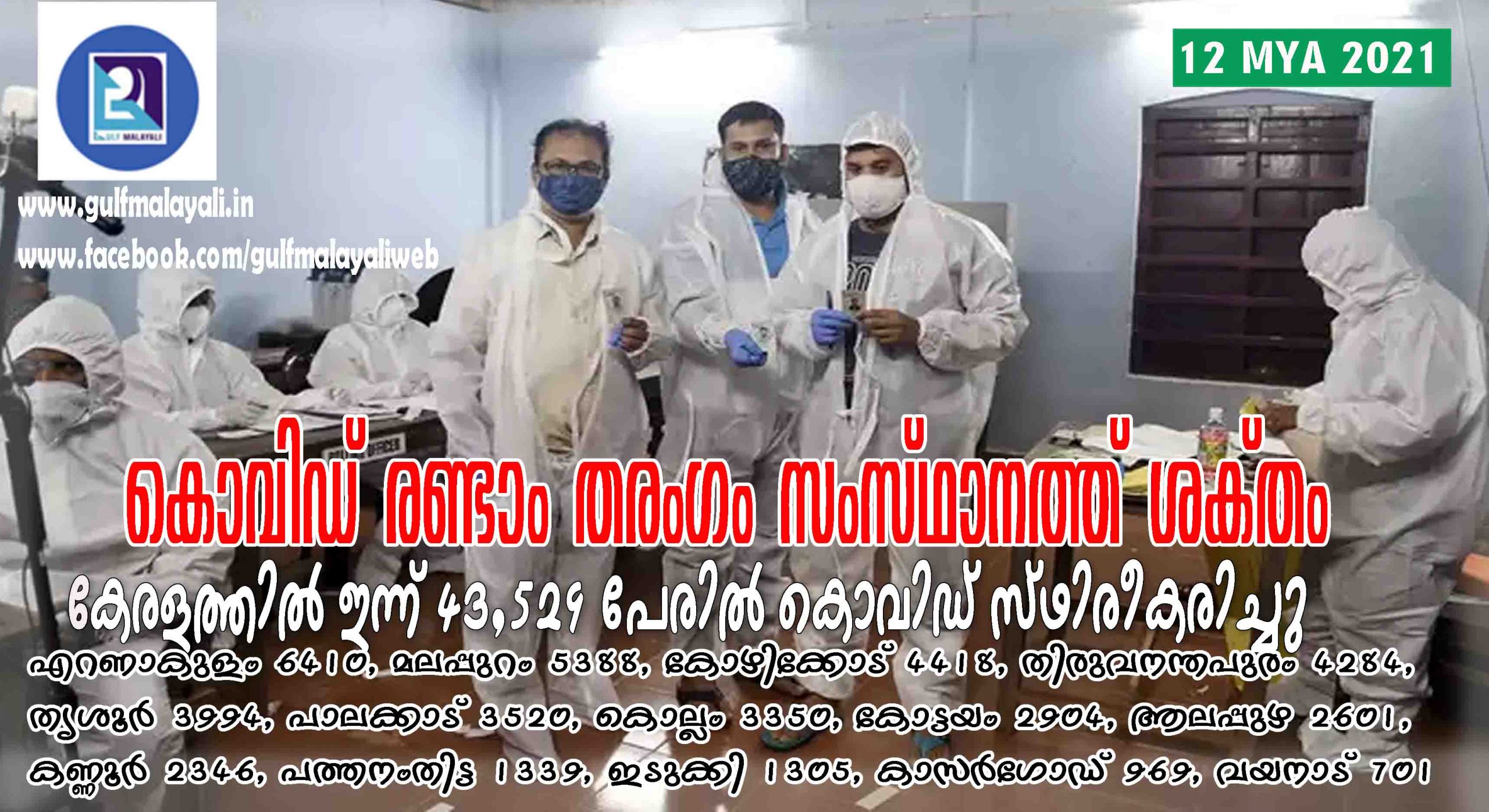 കൊവിഡ് രണ്ടാം തരംഗം സംസ്ഥാനത്ത് ശക്തം; കേരളത്തില് ഇന്ന് 43,529 പേരില് കൊവിഡ്-19 സ്ഥിരീകരിച്ചു