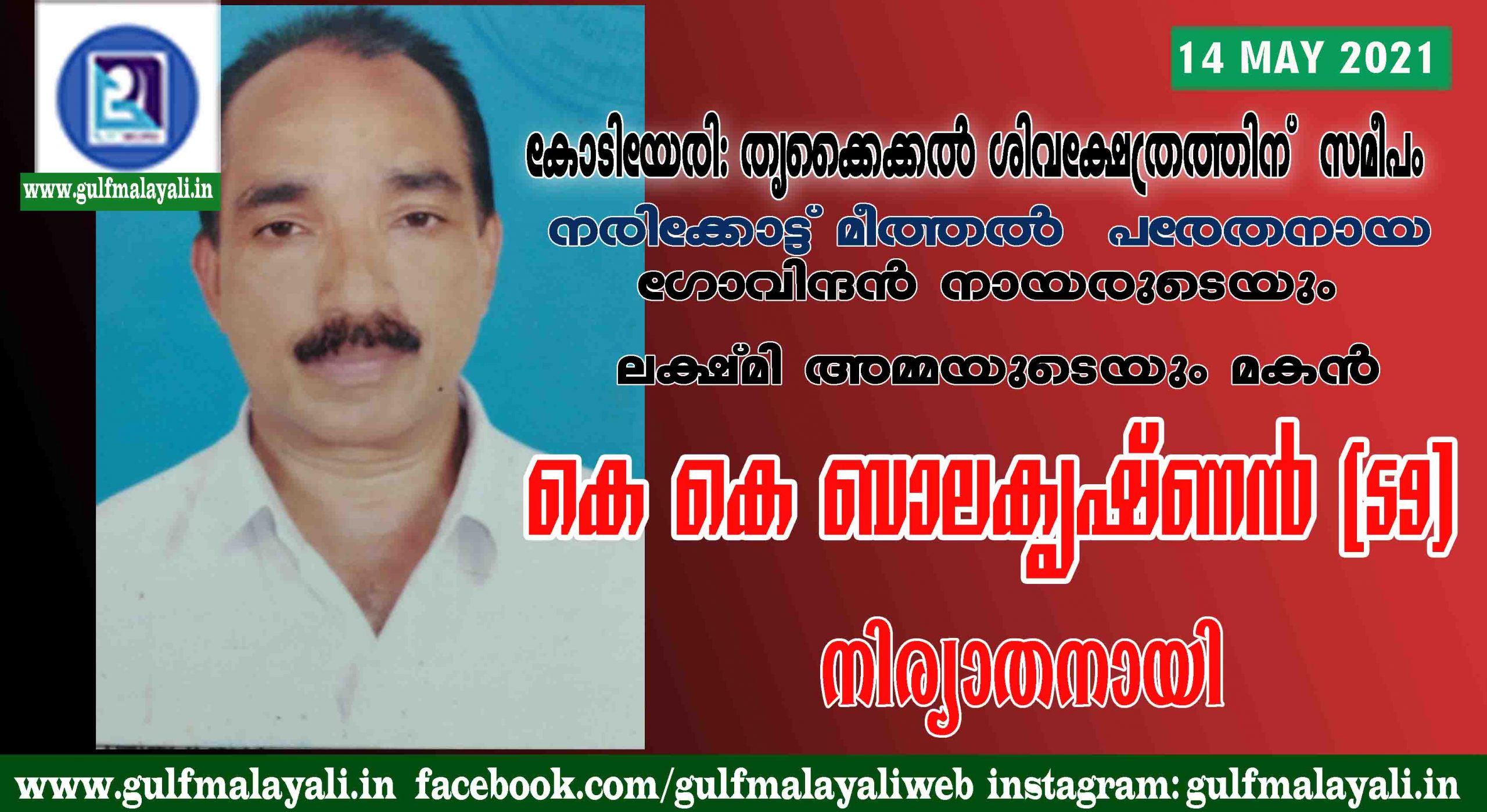 കോടിയേരി: തൃക്കൈക്കൽ ശിവക്ഷേത്രത്തിന് സമീപം നരിക്കോട്ട് മീത്തൽ പരേതനായ ഗോവിന്ദൻ നായരുടെയും ലക്ഷ്മി അമ്മയുടെയും മകൻ കെ കെ ബാലകൃഷ്ണൻ (59) നിര്യാതനായി കോടിയേരി ബ്ലോക്ക് കോൺഗ്രസ് സെക്രട്ടറിയായിരുന്നു. ഭാര്യ അജിത. സഹോദരങ്ങൾ ഭാസ്കരൻ (റിട്ടയർഡ് സൈനിക ക്ഷേമ ഓഫീസർ), സുമതി