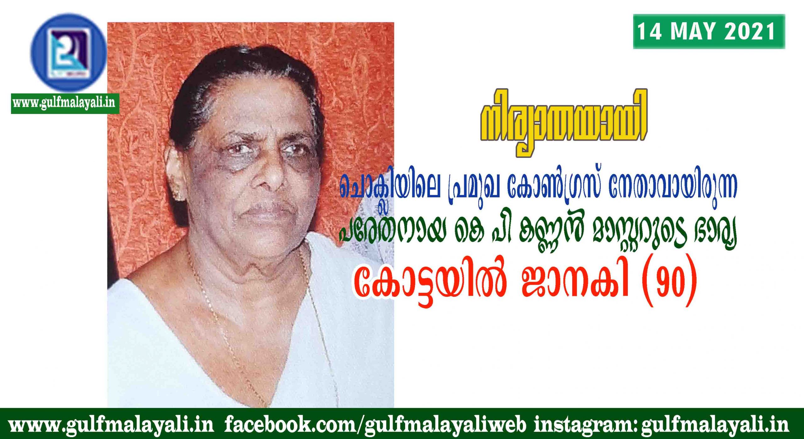 തലശ്ശേരി: ചൊക്ലിയിലെ പ്രമുഖ കോൺഗ്രസ് നേതാവായിരുന്ന പരേതനായ കെ പി കണ്ണൻ മാസ്റ്ററുടെ ഭാര്യ കോട്ടയിൽ ജാനകി (90) നിര്യാതയായി.