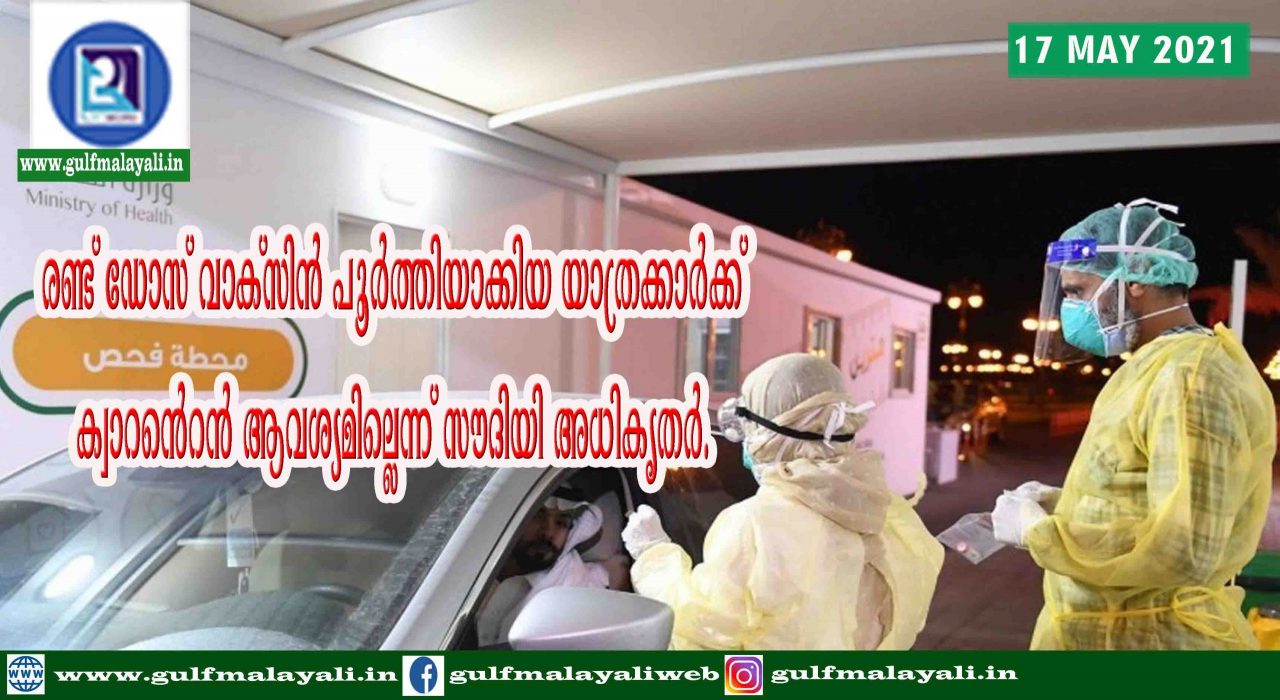 രണ്ട് ഡോസ് വാക്സിന് പൂര്ത്തിയാക്കിയ യാത്രക്കാര്ക്ക് ക്വാറന്റെന് ആവശ്യമില്ലെന്ന് സൗദിയി അധികൃതര്