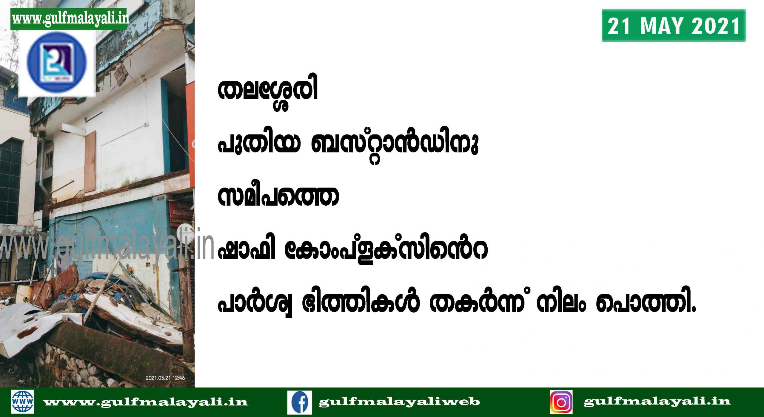 തലശേരി: പുതിയ ബസ്റ്റാൻന്റിനു സമീപത്തെ ഷാഫി കോംപ്ളക്സിന്റെ പാര്ശ്വ ഭിത്തികള് തകര്ന്ന് നിലം പൊത്തി. കോംപ്ളക്സിനു കീഴില് പ്രവര്ത്തിക്കുന്ന ടയര് കടയുടെ മുകളില് കോണ്ക്രീറ്റ് പാളികള് വീണ് പൂര്ണമായി തകര്ന്നു. മുത്തൂറ്റ് ഫൈനാന്സ്, ബൂട്സ് ഷോപ്പ് അടക്കം നിരവധി കടകള് പ്രവര്ത്തിക്കുന്ന കോംപ്ളക്സാണിത്. ലോക്ക്ഡൗണ് ആയതിനാല് വലിയ ദുരന്തം ഒഴിവാകുകയായിരുന്നു.
