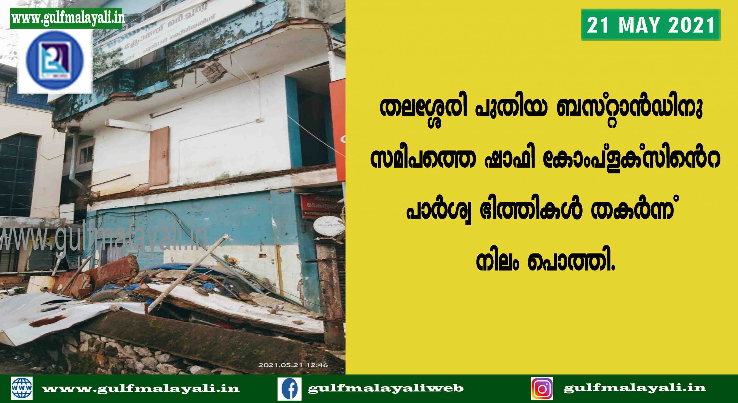 തലശ്ശേരി: പുതിയ ബസ്റ്റാന്ഡിനു സമീപത്തെ ഷാഫി കോംപ്ളക്സിന്റെ പാര്ശ്വ ഭിത്തികള് തകര്ന്ന് നിലം പൊത്തി. കോംപ്ളക്സിനു കീഴില് പ്രവര്ത്തിക്കുന്ന ടയര് കടയുടെ മുകളില് കോണ്ക്രീറ്റ് പാളികള് വീണ് പൂര്ണമായി തകര്ന്നു. മുത്തൂറ്റ് ഫൈനാന്സ്, ബൂട്സ് ഷോപ്പ് അടക്കം നിരവധി കടകള് പ്രവര്ത്തിക്കുന്ന കോംപ്ളക്സാണിത്. ലോക്ക്ഡൗണ് ആയതിനാല് വലിയ ദുരന്തം ഒഴിവാകുകയായിരുന്നു.