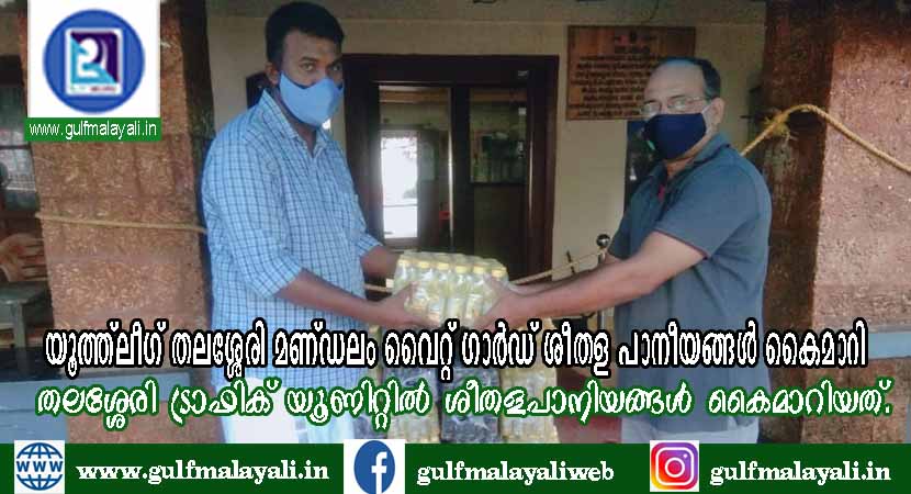 തലശ്ശേരി: യൂത്ത്ലീഗ് തലശ്ശേരി മണ്ഡലം വൈറ്റ് ഗാര്ഡിന്റെ നേതൃത്വത്തില് തലശ്ശേരി ട്രാഫിക് യൂണിറ്റില് ശീതളപാനിയങ്ങള് കൈമാറി. ട്രാഫിക് എ.എസ്.ഐ ഹരികൃഷ്ണന് കെ.ടി.കെ യെ തലശ്ശേരി മണ്ഡലം യൂത്ത്ലീഗ് ജനറല് സെക്രട്ടറി തഫ്ലീം മാണിയാട്ടാണ് ശീതളപാനിയങ്ങള് ഏല്പിച്ചത്.