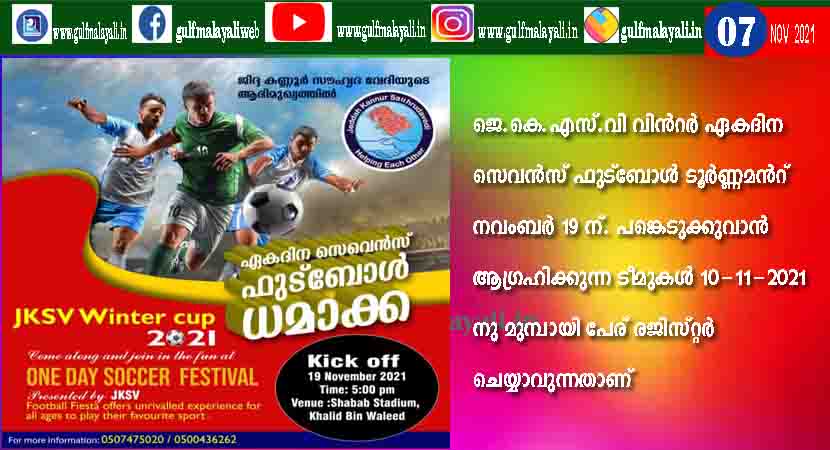 ജെ.കെ.എസ്.വി വിന്റര് ഏകദിന സെവന്സ് ഫുട്ബോള് ടൂര്ണ്ണമന്റ് നവംബര് 19 ന്