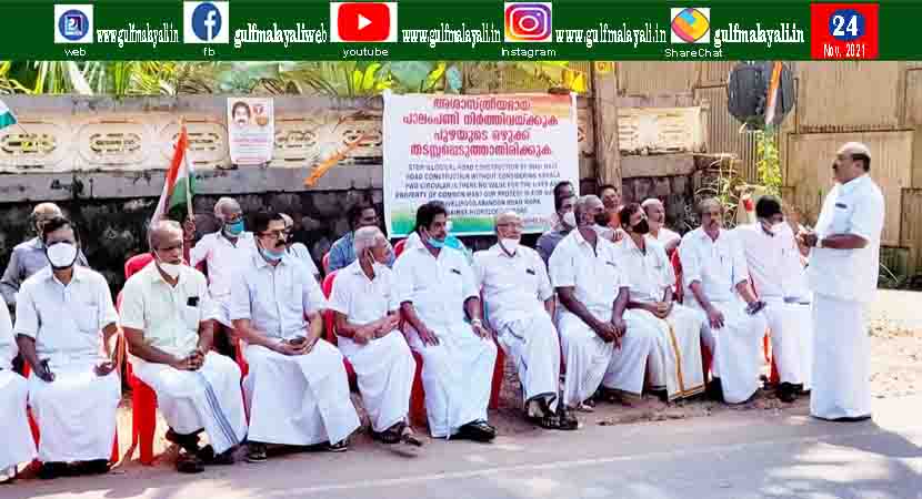 പുഴയിൽ മണ്ണിട്ട് നികത്തി റോഡ് നിർമ്മിക്കാനുള്ള കരാർ കമ്പനിയുടെ നീക്കത്തിനെതിരെ കോൺഗ്രസ് പ്രതിഷേധ ധർണ നടത്തി