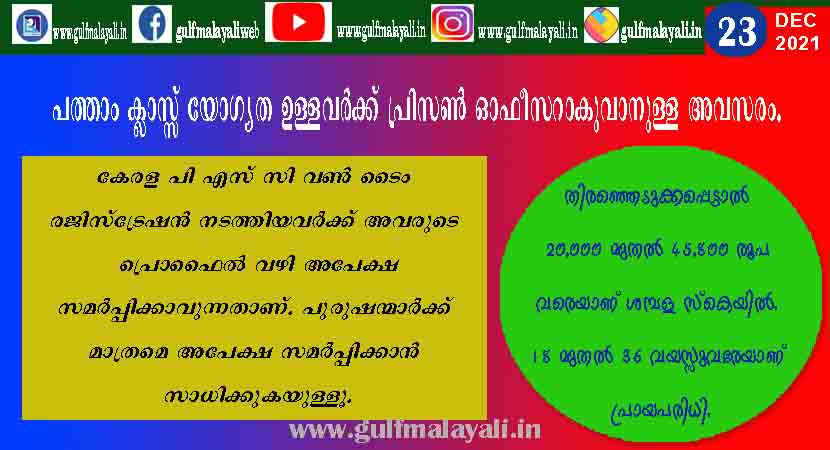 കണ്ണൂര്: പത്താം ക്ലാസ്സ് യോഗ്യത ഉള്ളവര്ക്ക് പ്രിസണ് ഓഫീസര് ആകുവാനുള്ള അവസരം. കേരള പി എസ് സി വണ് ടൈം രജിസ്ട്രേഷന് നടത്തിയവര്ക്ക് അവരുടെ പ്രൊഫൈല് വഴി അപേക്ഷ സമര്പ്പിക്കാവുന്നതാണ്. പുരുഷന്മാര്ക്ക് മാത്രമെ അപേക്ഷ സമര്പ്പിക്കാന് സാധിക്കുകയുള്ളൂ.