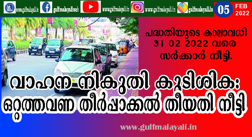 പാലക്കോട്: ബഡ്ജറ്റിൽ സർക്കാർ പ്രഖ്യാപിച്ച വാഹന നികുതി കുടിശിക ഒറ്റത്തവണ തീർപ്പാക്കൽ പദ്ധതിയുടെ കാലാവധി 31 02 2022 വരെ സർക്കാർ നീട്ടി.