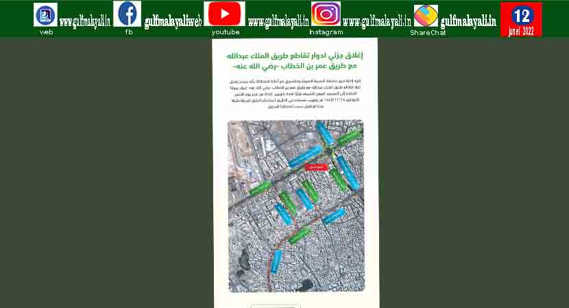 മദീന: പ്രവാചകന്റെ മസ്ജിദിലേക്ക് പോകുന്ന കിംഗ് അബ്ദുല്ല റോഡിനെയും ഒമര് ഇബ്നു അല്-ഖത്താബ് റോഡിനെയും തമ്മില് ബന്ധിപ്പിക്കുന്ന റൗണ്ട്എബൗട്ട് (ഉര്വ റൗണ്ട്എബൗട്ട്) ഭാഗികമായി അടച്ചു. അല്മദീന അല്മുനവ്വറ റീജിയണിലെ ട്രാഫിക് ഡിപ്പാര്ട്ട്മെന്റ്, റീജിയണിലെ മുനിസിപ്പാലിറ്റിയുമായി ഏകോപിപ്പിച്ചാണ് റോഡ് അടക്കുന്നത്.