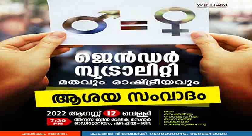എന്ന വിഷയത്തില് ജന്ഡര് ന്യൂട്രാലിറ്റി ജിദ്ദ ദഅവ കോര്ഡിനേഷന് കീഴില് ആശയ സംവാദം സംഘടിപ്പിക്കുന്നു. 12ാം തീയ്യതി വെള്ളിയാഴ്ച അനസ് ബിന് മാലിഖ് സെന്ററില് വെച്ചാണ് പരിപാടി നടക്കുക.