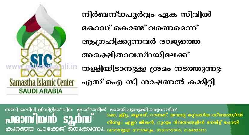 ഏക സിവിൽ കോഡ് നടപ്പാക്കാനുള്ള നീക്കങ്ങൾക്കെതിരെ സമസ്ത കേരള ജംഇയ്യത്തുൽ ഉലമ നടത്തുന്ന നീക്കങ്ങൾ വിജയിപ്പിക്കാൻ ഏവരും കർമ്മ രംഗത്തിറങ്ങണം. സമസ്തയുടെ ആഹ്വാനം വിജയിപ്പിക്കാൻ വേണ്ട പദ്ധതികൾ കൈകൊള്ളാൻ, നാഷണൽ തലത്തിലും നടപടികൾ കൈകൊള്ളാൻ സൗദിയിലെ പ്രവിശ്യ, സെൻട്രൽ കമ്മിറ്റി കൾക്ക് നിർദേശം നൽകിയതായും നാഷണൽ കമ്മിറ്റി പ്രസിഡന്റ് സയ്യിദ് ഉബൈദുല്ല തങ്ങൾ അൽ ഹൈദറൂസി ജിദ്ദ, ജനറൽ സിക്രട്ടറി അറക്കൽ അബ്ദുറഹ്മാൻ മൗലവി, ട്രഷറർ ഇബ്റാഹീം ഓമശേരി എന്നിവർ പ്രസ്താവനയിൽ അറിയിച്ചു.