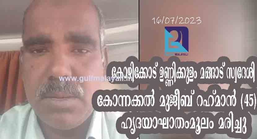 റിയാദ്: റിയാദിലെ മുസാഹ്മയില് കോഴിക്കോട് ഉണ്ണിക്കുളം മങ്ങാട് സ്വദേശി കോന്നക്കല് മുജീബ് റഹ്മാന് (45) ഹൃദയാഘാതം മൂലം നിര്യാതനായി. ഡ്രൈവറായി ജോലിചെയ്തു വരികയായിരുന്നു. മാതാവ്: ആമിന. ഭാര്യ: സാജിദ. മക്കള്: അബ്ദുല് മുസവ്വിര്, ആമിന മുംജിത. മൃതദേഹം നാട്ടിലേക്ക് കൊണ്ടുപോകുവാനുള്ള നടപടിക്രമങ്ങള് നടന്നുവരുന്നു.