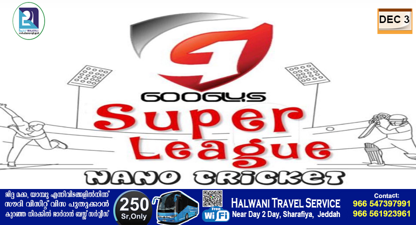 ജിദ്ദ: ജിദ്ദയിലെ പ്രമുഖ സ്പോര്ട്സ് ക്ളബായ ഗൂഗ്ളീസ് നാനോ ക്രിക്കറ്റ് ടൂര്ണ്ണമൊന്റ് ഡിസംബര് 15, 22 എന്നീ വെള്ളിയാഴ്ചകളില് ജിദ്ദയില് നടക്കും. ഉച്ചക്ക് 2 മണിമുതല് രാത്രി 11 മണി വരെ ഫലസ്തീന് സ്ട്രീറ്റിലെ ഇഖ്ലാസ് ഗ്രൗണ്ടിലാണ് മല്സരം നടക്കുക. ജിദ്ദയിലെ പ്രമുഖരായ 12 ടീമുകള് മത്സരത്തില് മാറ്റുരക്കും. ജിദ്ദയിലെ കലാ, കായിക, സാംസ്കാരിക രഗത്തെ പ്രമുഖര് മത്സര വേദിയില് ഉണ്ടാകുമെന്ന് ചെയര്മാന് റഷീദ് അലി അറിയിച്ചു.