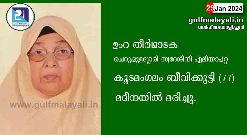 മദീന: ചെറുപ്പുളശ്ശേരി എലിയാപറ്റ സ്വദേശിനി കൂടമംഗലം ബീവിക്കുട്ടി (77) മദീനയില് മരിച്ചു. ദേഹാസ്വസ്ഥത്തെ തുടര്ന്ന് ആശുപത്രിയില് പ്രവേശിപ്പിച്ചുവെങ്കിലും മരിക്കുകയായിരുന്നു. സ്വകാര്യ ഗ്രൂപ്പില് ഉംറ നിര്വഹിക്കാനെത്തിയതാണ്. മക്കള് കൂടെയുണ്ട്.
