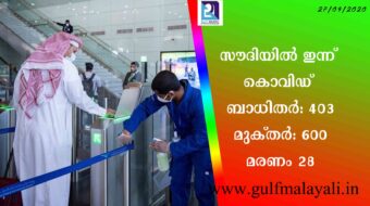 റിയാദ്: സൗദിയില് ഇന്ന് കൊവിഡ് രോഗം റിപ്പോര്ട്ട് ചെയ്ത് 403 പേരില്. 28 പേര് കൊവിഡ് ബാധിച്ച് മരിച്ചതായും ഇന്ന്