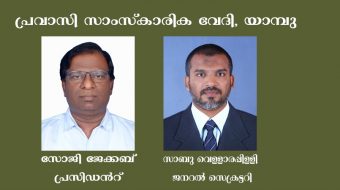 യാമ്പു(സൗദി അറേബൃ): പ്രവാസി സാംസ്കാരിക വേദി യാമ്പു മേഖലക്ക് പുതിയ ഭാരവാഹികളെ തെരഞ്ഞെടുത്തു. സോജി ജേക്കബ് (പ്രസിഡന്റ്), മുഹമ്മദ് ശരീഫ്