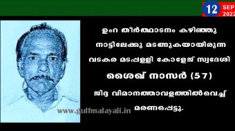 ജിദ്ദ: ഉംറ തീര്ത്ഥാടനം കഴിഞ്ഞു നാട്ടിലേക്കു മടങ്ങവേ തീര്ത്ഥാടകനായ വടകര മടപ്പള്ളി കോളേജ് സ്വദേശി ശൈഖ് നാസര് (57) ജിദ്ദ