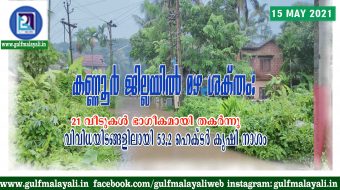കണ്ണൂര്: ന്യൂനമര്ദ്ദത്തെ തുടര്ന്നുണ്ടായ ശക്തമായ കാറ്റിലും മഴയിലും കണ്ണൂര് ജില്ലയില് വന് നാശം. 21 വീടുകള് ഭാഗികമായും ഒരു കിണര്