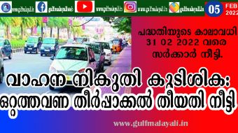 പാലക്കോട്: ബഡ്ജറ്റിൽ സർക്കാർ പ്രഖ്യാപിച്ച വാഹന നികുതി കുടിശിക ഒറ്റത്തവണ തീർപ്പാക്കൽ പദ്ധതിയുടെ കാലാവധി 31 02 2022 വരെ സർക്കാർ
