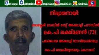 തലശ്ശേരി: ടെമ്പിള് ഗേറ്റ് അക്കാളി ഹൗസില് കെ.പി ലക്ഷ്മണന് (73) നിര്യാതനായി. പരേതരായ അക്കാളി ഗോവിന്ദന്റെയും കെ.പി ദേവകിയുടെയും മകനാണ്.