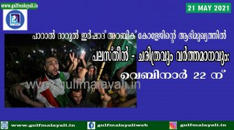 തലശ്ശേരി: പാറാൽ ദാറുൽ ഇർഷാദ് അറബിക് കോളേജിൻ്റെ ആഭിമുഖ്യത്തിൽ പലസ്തീൻ- ചരിത്രവും വർത്തമാനവും എന്ന വിഷയത്തിൽ വെബിനാർ നടത്തുന്നു. മെയ്