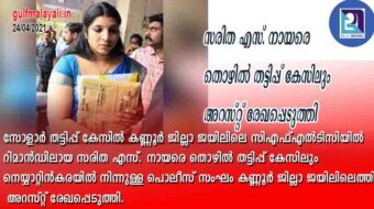 കണ്ണൂര്: സോളാര് തട്ടിപ്പ് കേസില് കണ്ണൂര് ജില്ലാ ജയിലിലെ സിഎഫ്എല്ടിസിയില് റിമാന്ഡിലായ സരിത എസ്. നായരെ തൊഴില് തട്ടിപ്പ് കേസിലും