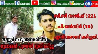 ചെറുവാഞ്ചേരി: കണ്ണൂരില് രണ്ട് യുവാക്കള് പുഴയില് മുങ്ങി മരിച്ചു. പൂവ്വത്തൂര് പാലത്തിന് സമീപം കൊല്ലംകുണ്ട് പുഴയില് കുളിക്കാനിറങ്ങിയ യുവാക്കളാണ് മുങ്ങിമരിച്ചത്.